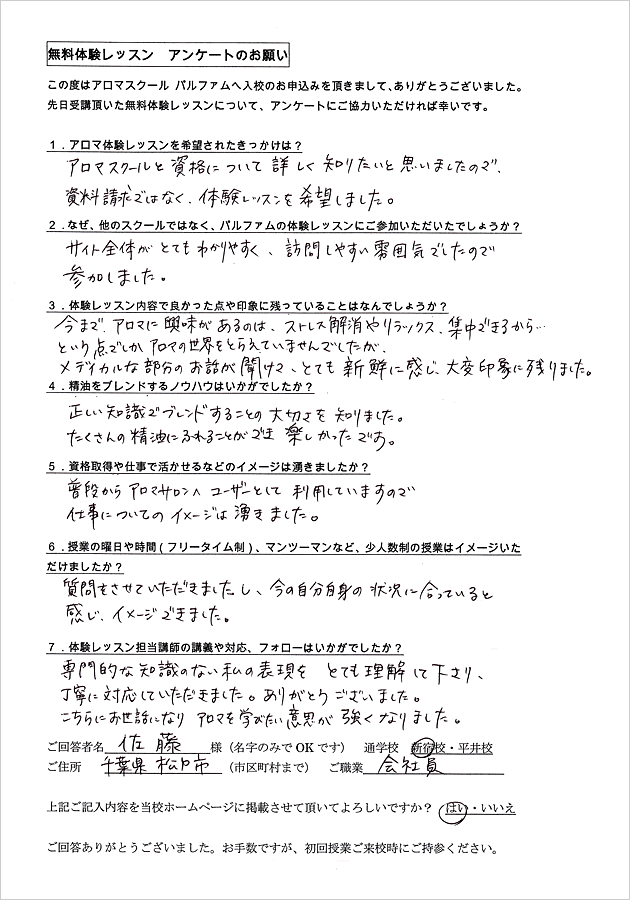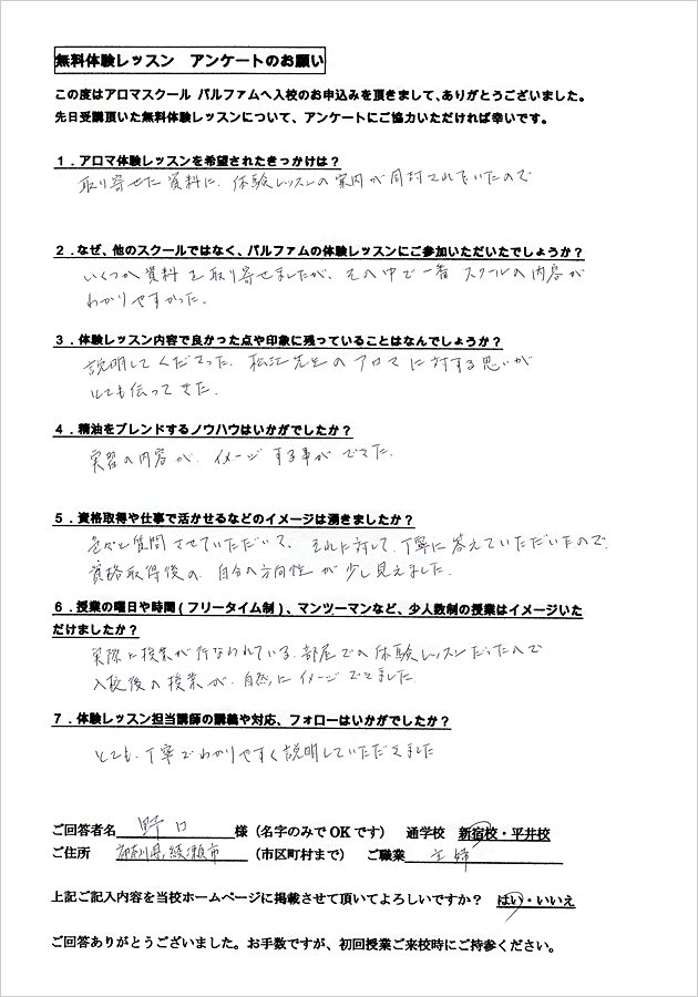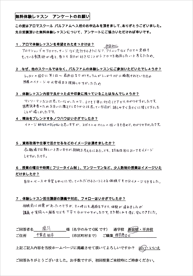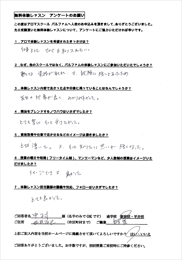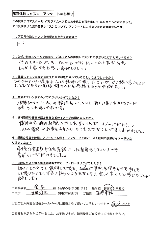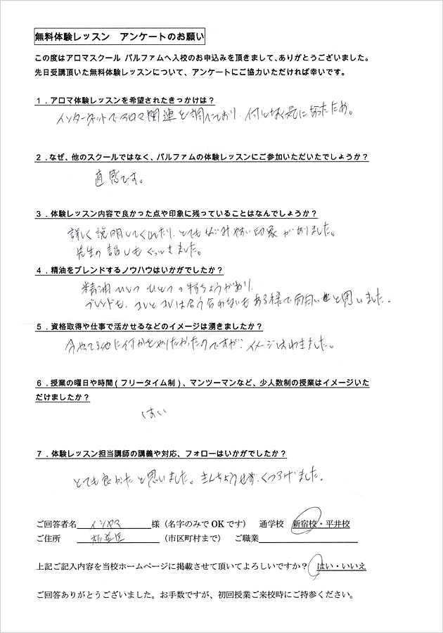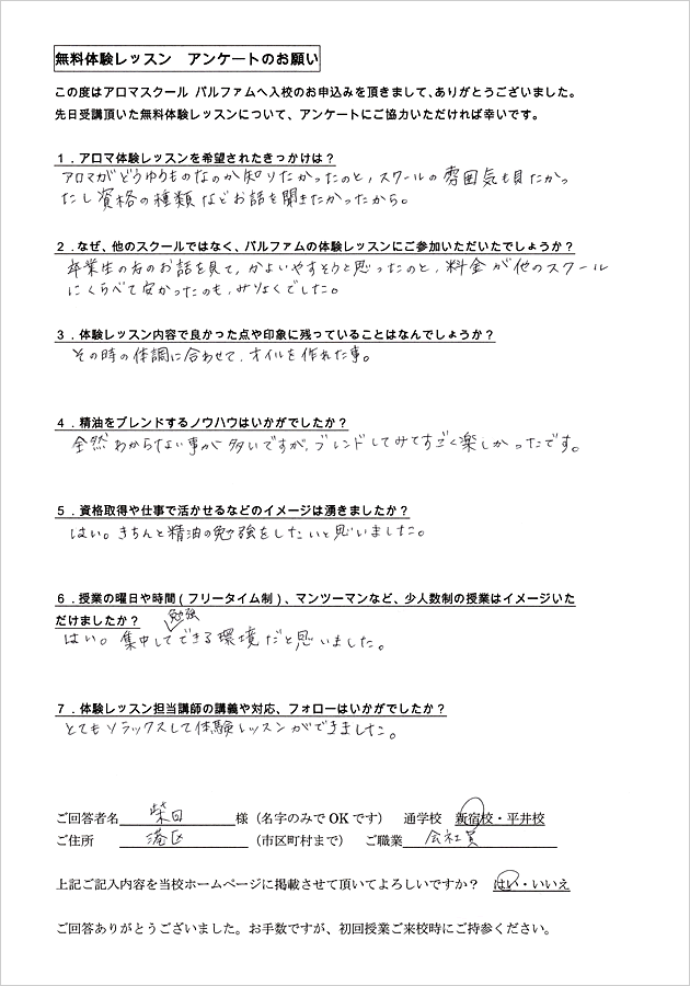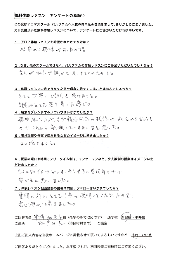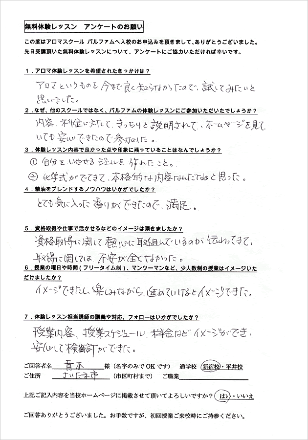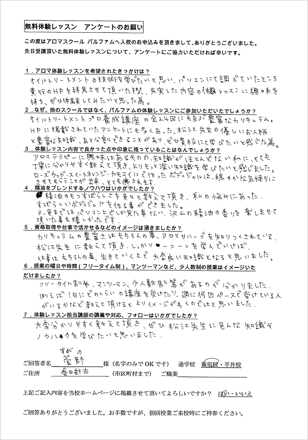 アロマテラピーは全くの初心者で私にできるのかとても不安でした。体験レッスンを受けてみて、実際に自分が授業を受けている姿が自然とイメージでき、良かったです。