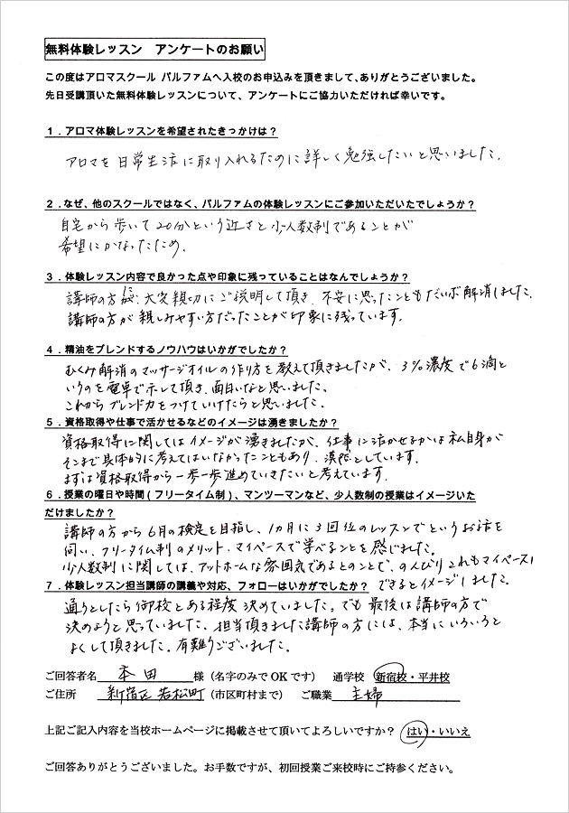 『一対一で対応していただき、質問にはすべて丁寧に時間をかけて説明していただけました。アロマについて学ぶことに興味があり、スクールについて詳しく説明を聞いてみたいと思っていたので、授業の様子がよくわかりました。』高田 様(東京都多摩市・会社員)