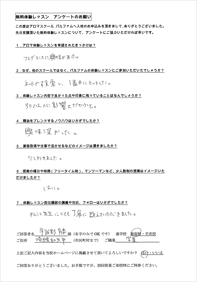 『アロマの体験だけでなく、セラピスト業界のお話を詳しく聞き、これからの進路をじっくり相談できました。目標を明確にした後、コース選びができたことは非常に良かったです。』田中 様(埼玉県狭山市・会社員)